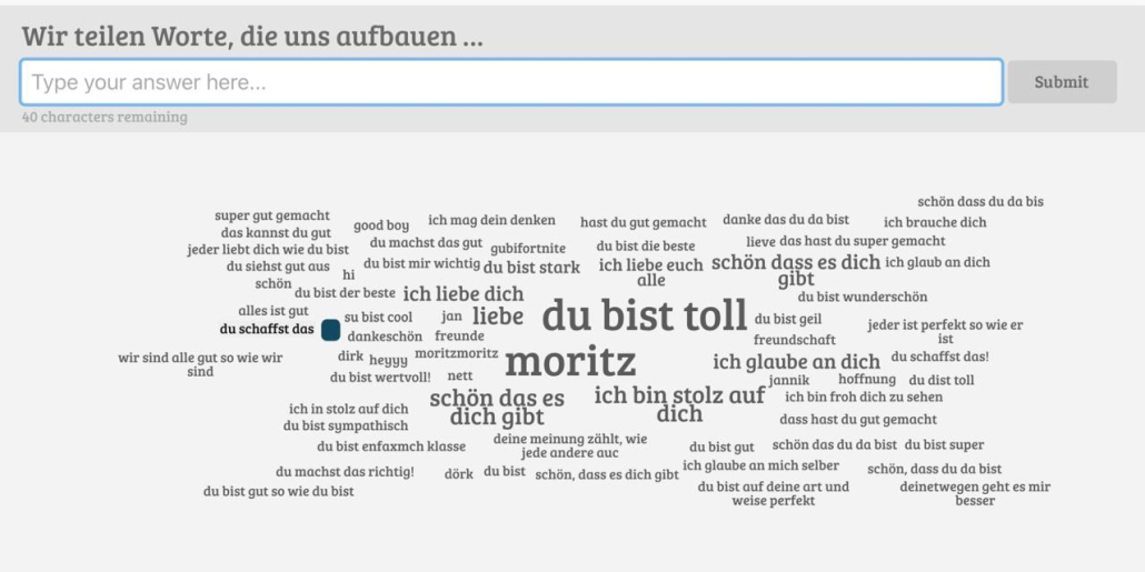 Über einen QR-Code konnten die Schülerinnen und Schüler ihre eigenen Worte der Wärme teilen. Aus allen Beiträgen entstand am Ende eine Wortwolke, die zeigt, wie viele gute Gedanken in unserer Gemeinschaft leben. Der QR-Code bleibt noch eine Woche aktiv, sodass weiterhin Worte geteilt werden können.