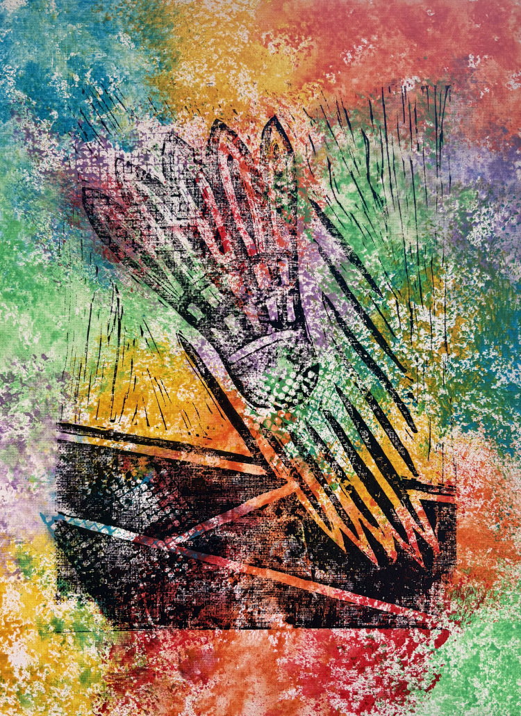 Der WP-Kunst-Kurs 9e/f hat sich zunächst theoretisch mit den vier Drucktechniken beschäftigt – Hochdruck, Tiefdruck, Flachdruck und Durchdruck. Die Schülerinnen und Schüler recherchierten im Zuge dessen Arbeiten u.a. von Banksy, Kollwitz und Warhol. Davon inspiriert, folgte die praktische Arbeit.