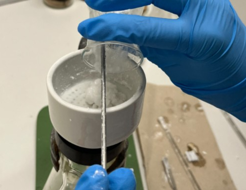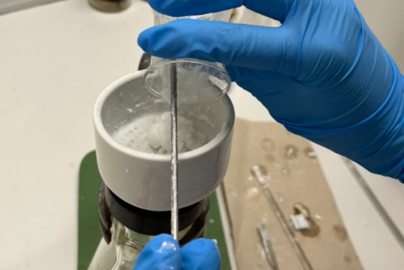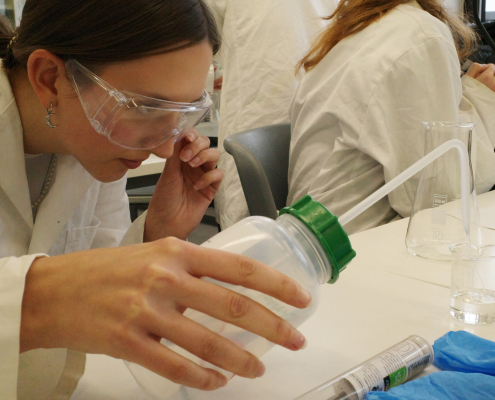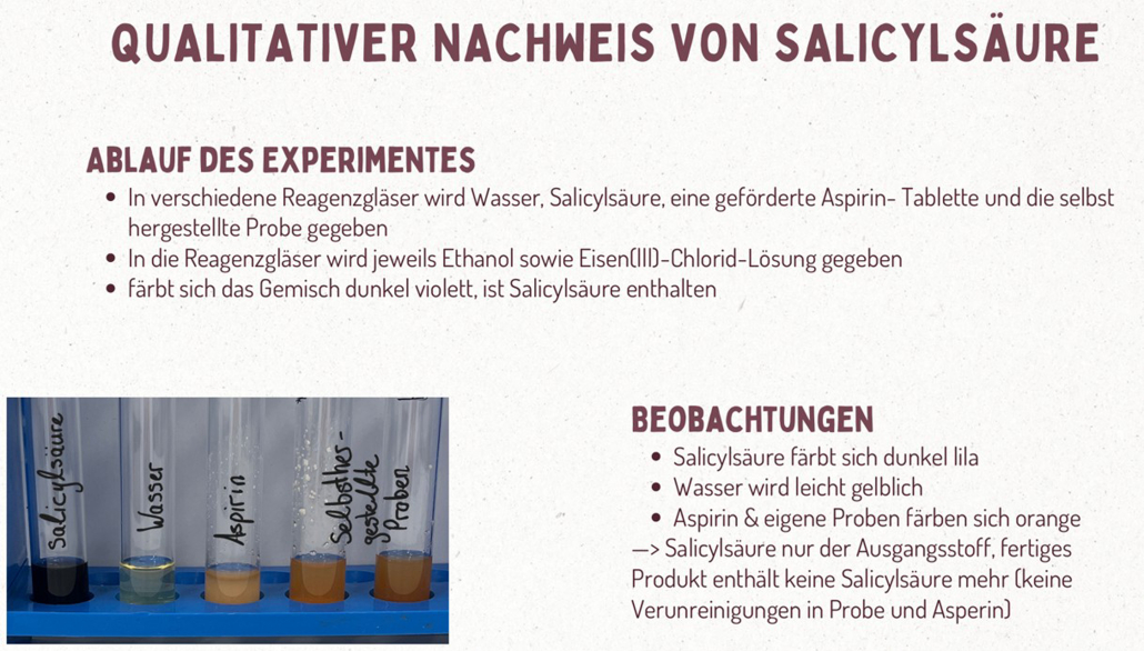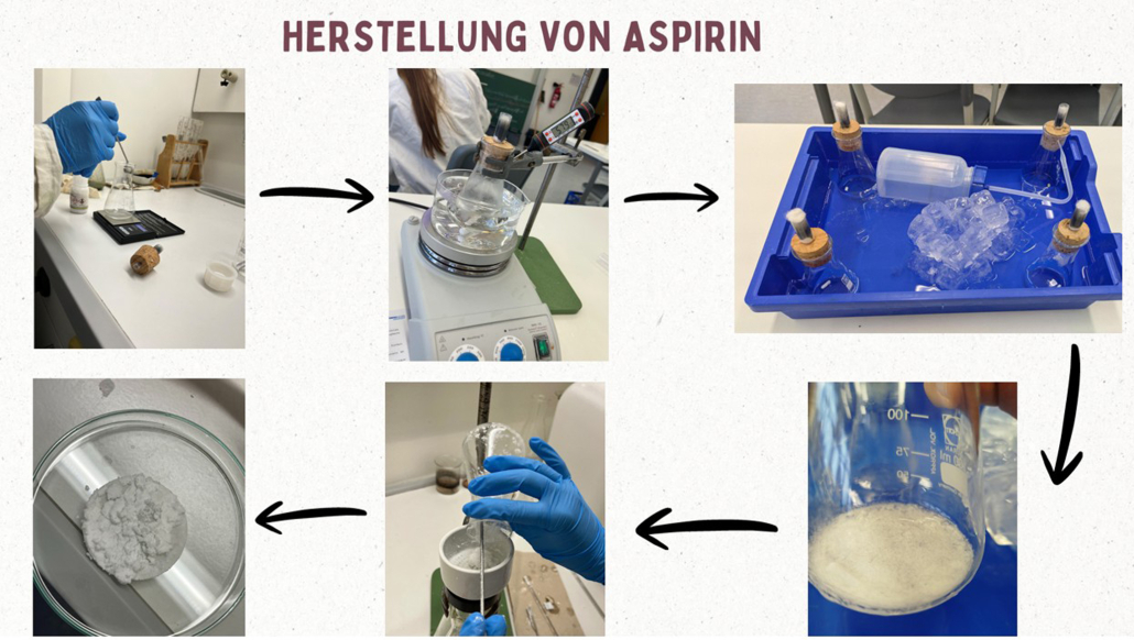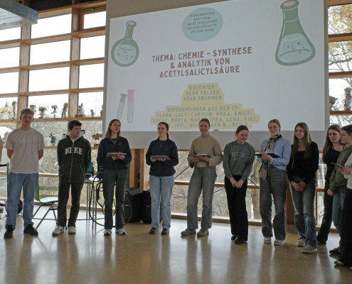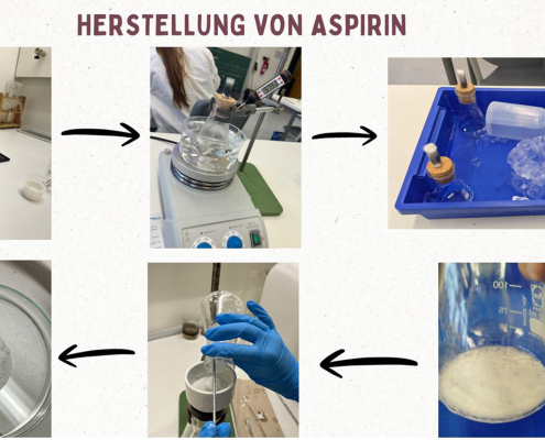 Das Clara-Fey-Gymnasium durfte das Schülerlabor „Chemical and Educational Research (kurz: CheERs!)“ der RWTH Aachen an den MINT-Tagen für die EF begrüßen. Thema: Synthese von Aspirin. Und das durchaus komplexe Thema schien den Schüler:innen unter der fachkundigen Anleitung von Philipp Pelzer und Jonas Prümmer leicht zu fallen. Sie synthetisierten Aspirin und prüften ihr Produkt auf Reinheit. Die Qualitätsanalyse zeigt, dass durchweg sauber und erfolgreich gearbeitet worden war. Auf der Bühne der Abschlusspräsenation zeigten die Schüler:innen, dass sie die einzelnen Arbeitsgänge dem Publikum transparent erklären konnten.