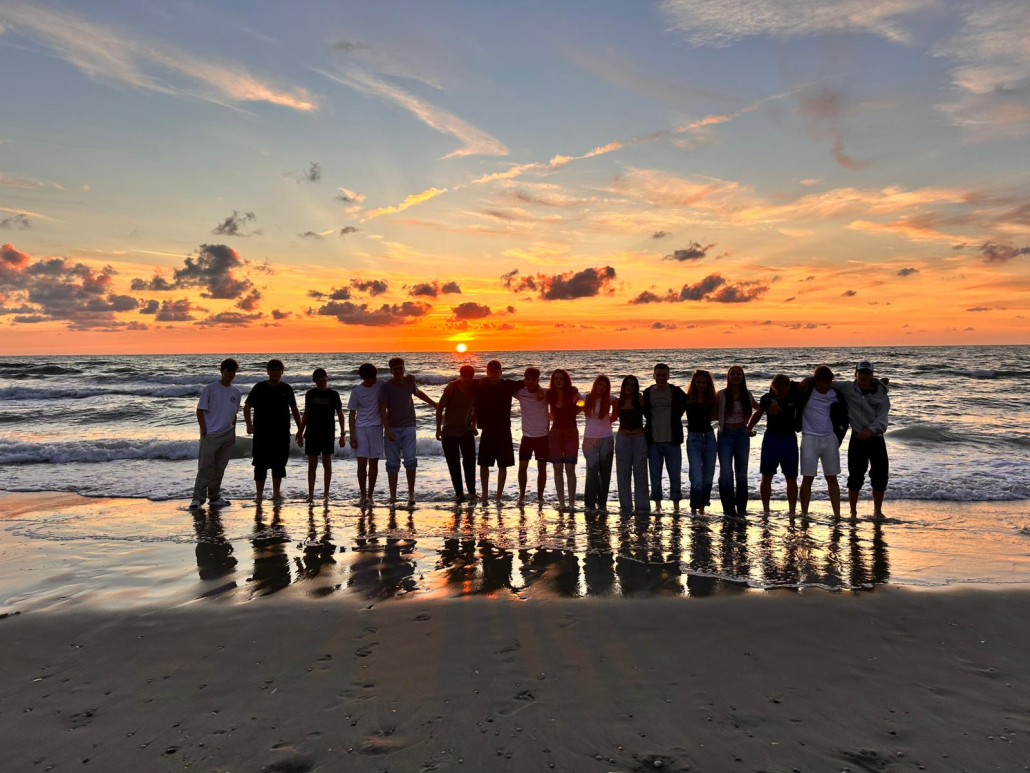 Später entschieden sich einige, noch mit den Fahrrädern zum Strand zu fahren, um den Sonnenuntergang zu genießen. Mit guter Laune radelten wir los. Am Strand wurden Fotos gemacht, Volleyball gespielt oder einfach nur entspannt. Natürlich wollten auch viele mit den Füßen ins Wasser also Hosen hochgekrempelt und rein. Doch dann kam plötzlich eine Welle, und schon waren alle Hosen nass und voller Sand.