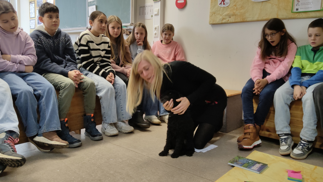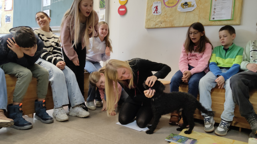 Bereitwillig präsentierte Samson seine 42 Pudelzähne, sodass die Klasse viel über Schneide-, Fang- und Reißzähne sowie deren Funktionen erfahren konnte. Die Schülerinnen und Schüler lernten, wie ein Hund lange gesunde Zähne behalten kann, was es mit der sogenannten „Brechschere“ auf sich hat und wie der Zahnwechsel bei Welpen abläuft.
