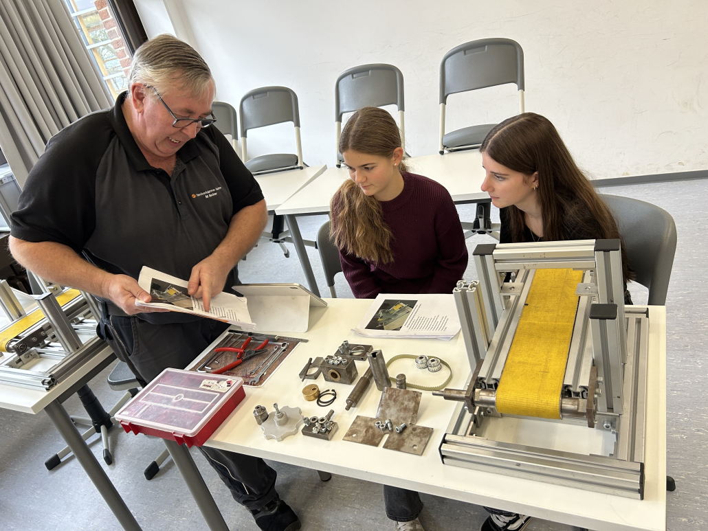 Bei den Sanitär- und Heizungs- und Klimainstallateuren stand der Aufbau einer Wasserleitung im Mittelpunkt. Die Schülerinnen und Schüler konnten selbst Rohre verbinden und abdichten – ein spannender Einblick in die Technik, die hinter der alltäglichen Wasserversorgung steckt. Der Feinmechaniker wiederum unterstützte die Jugendlichen beim Bau eines Förderbands, bei dem millimetergenaue Mechanik und Teamarbeit gefragt waren.