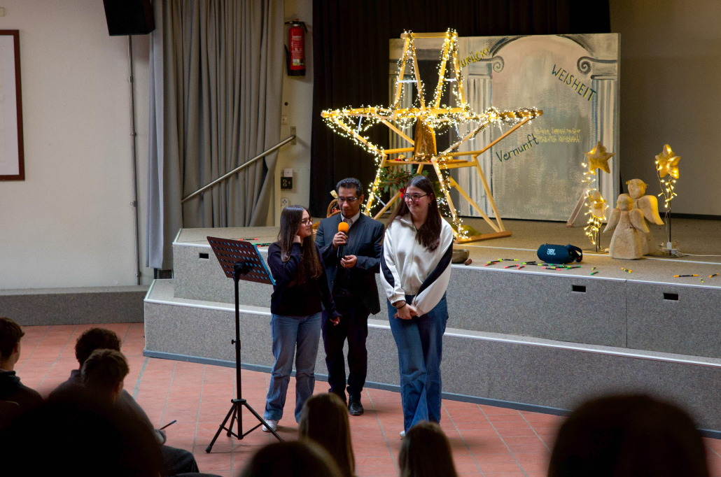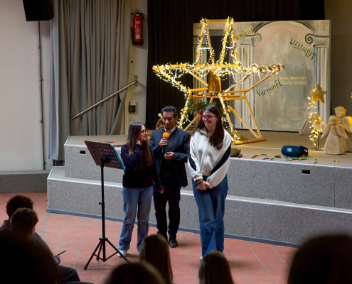 Diese Fragen dienten als zentrale Impulse der Weihnachtsgottesdienste an unserer Schule. Ein Auszug aus der Weihnachtsgeschichte nach dem Evangelisten Lukas lenkte den Blick auf die Situation der Heiligen Familie: Maria und Josef mussten Jesus in einem Stall zur Welt bringen; keine gemütliche, sondern eine von Unsicherheit, Leid und Verzweiflung geprägte Situation. Und doch erschien gerade in dieser Dunkelheit ein Licht, in dem das Göttliche erfahrbar wurde.