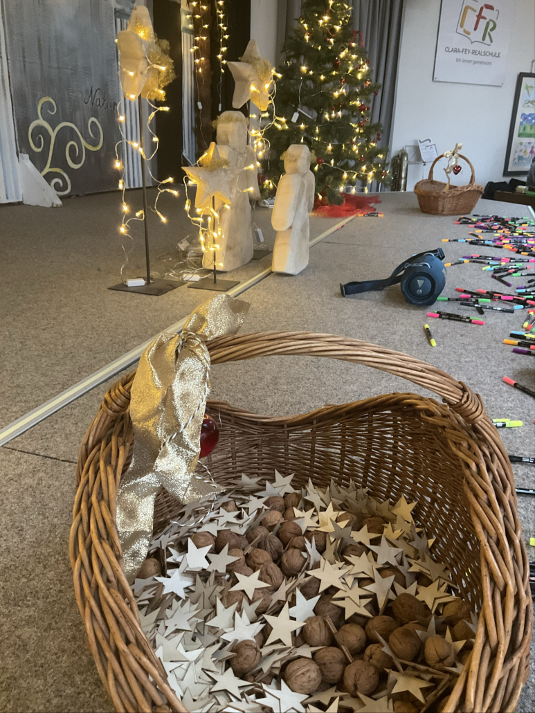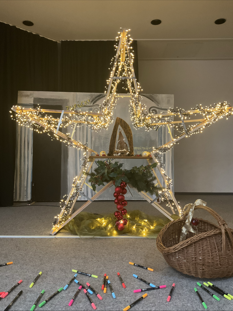 Jede Schülerin und jeder Schüler nahm den eigenen Stern als Andenken mit, verbunden mit der Einladung, ihn an die eigene Weihnachtskrippe zu Hause zu stellen. Er sollte als kleine Erinnerung in den Ferien dienen, dass wir in der Dunkelheit nicht allein sind: Der Retter ist da!