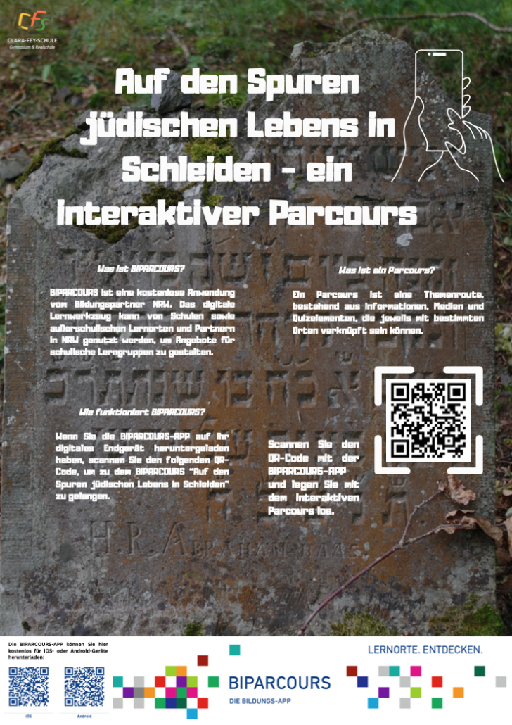 Vom 26. bis 30. Januar lädt die Clara-Fey-Schule in Schleiden zur Gedenkwoche für die Opfer des Nationalsozialismus ein. Unter dem diesjährigen Leitmotiv „Anne und ich: erinnere – bedenke – handle“ öffnet die Gedenken-AG Räume des Erinnerns, des Nachdenkens und des verantwortlichen Handelns. Herzstück der Woche ist eine Ausstellung, die von Schülerinnen und Schülern mit großer Sorgfalt vorbereitet wurde. Neben eigenen Arbeiten werden Plakate der digitalen Ausstellung des Anne-Frank-Zentrums präsentiert, ergänzt durch ein Video zur historischen Einordnung sowie weitere kreative Angebote, die Geschichte und Erinnerungskultur greifbar machen. Am 27. Januar, dem internationalen Holocaust-Gedenktag, hält die Schulgemeinschaft inne: Eine von Schülerinnen und Schülern gestaltete Schweigeminute setzt ein stilles, eindringliches Zeichen des Gedenkens. Darüber hinaus hat die Gedenk-AG einen interaktiven Parcours mit der BIPARCOURS APP entwickelt. Unter dem Titel „Auf den Spuren jüdischen Lebens in Schleiden“ lädt er zum Erkunden ein – offen für Schülerinnen und Schüler ebenso wie für interessierte Erwachsene. Die Gedenkwoche verbindet Erinnerung mit Gegenwart und ermutigt dazu, Verantwortung heute zu übernehmen.