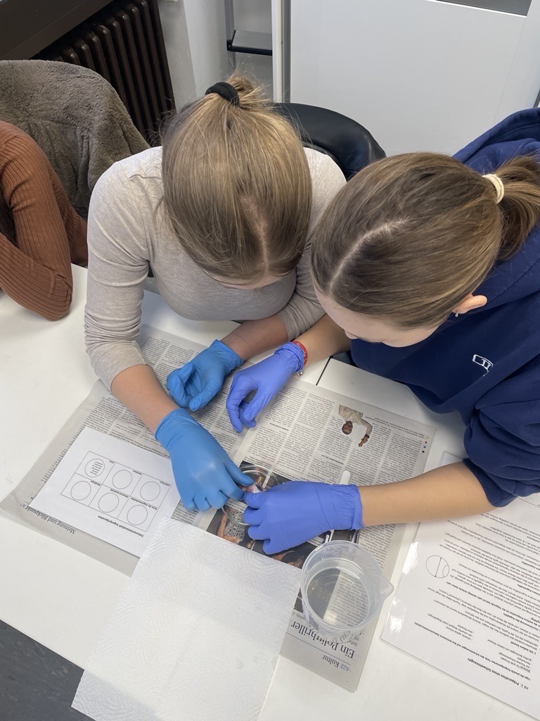 In den letzen Wochen beschäftigte sich der Humanbiologiekurs der 10. Klasse unter der Leitung von Frau Lantin mit dem Aufbau und der Funktion des menschlichen Auges. Dazu führten die Schülerinnen und Schüler am 15. Januar eine Präparation eines Schweineauges durch.