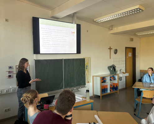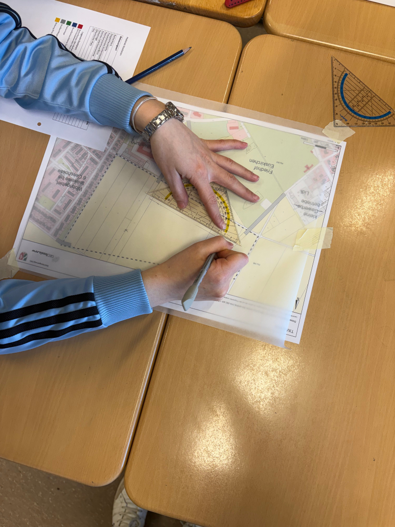 Ziel des Workshops war es, einen praxisnahen Einblick in das Berufsfeld der Stadtplanung zu gewinnen. Zu Beginn gab es einen kurzen theoretischen Einstieg, in dem sie über ihren Studiengang sowie ihren Arbeitsalltag berichtete. Dabei erklärte die Stadtplanerin, dass man in diesem Berufsfeld unter anderem Flächennutzungspläne, Entwürfe und Konzepte, beispielsweise für den Einzelhandel, entwickelt. Zudem berichtete sie über Grundinhalte der Stadt- und Raumplanung.
