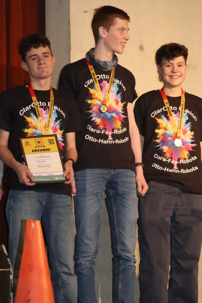 Nach einer guten Vorbereitung ging das Team zuversichtlich an den Start. Durch einen Sieg im Robot-Game, einen Pokal für das Roboter-Design und eine gute Vorstellung des Forschungsprojekts hat sich das Team als Zweiter für den westdeutschen Wettbewerb qualifiziert.