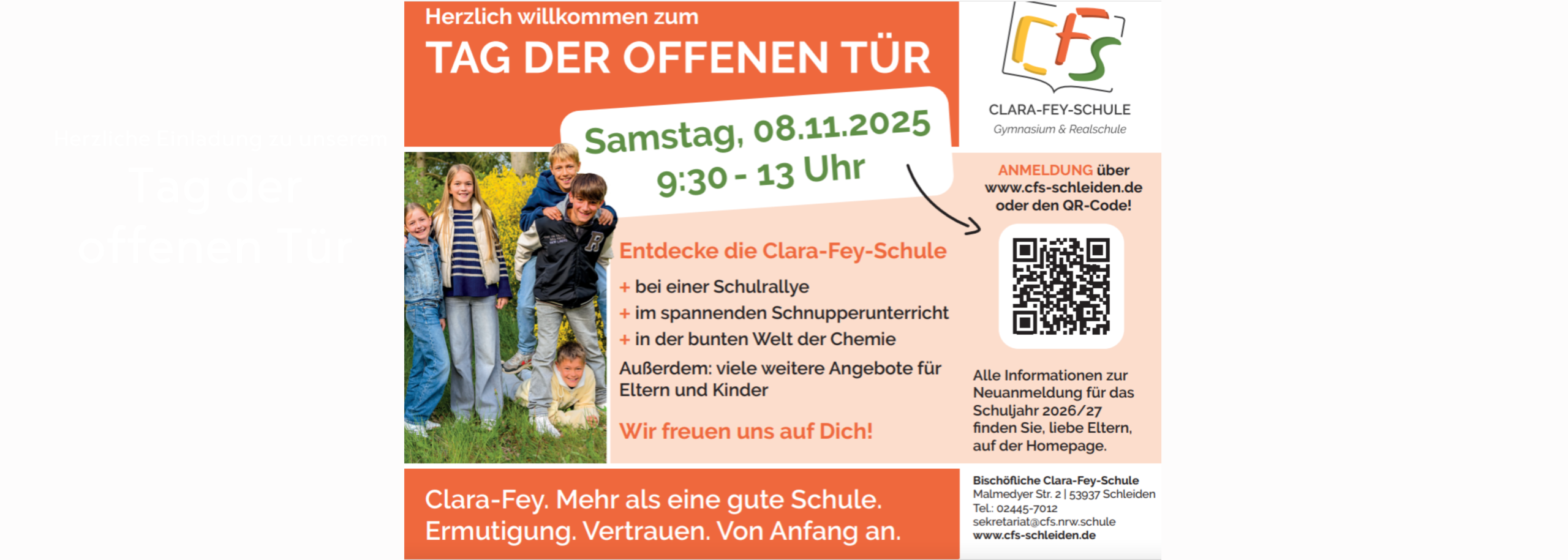 Herzlich willkommen an der Clara-Fey-Schule! Seit mehr als 60 Jahren haben wir uns als zuverlässige Bildungseinrichtung bewährt, die mit Engagement und Zuwendung zum höchsten deutschen Schulabschluss führt. „Mehr als eine gute Schule“ – das bedeutet für uns: Wir möchten unseren Schülerinnen und Schülern neben dem fundierten Unterricht einen warmherzigen Lebensraum bieten, in dem sie sich individuell entwickeln können. Dabei ist unser Bildungskonzept einzigartig: Als Bündelschule beherbergen wir zwei eigenständige Schulen – eine Realschule und ein Gymnasium – in einem gemeinsamen Umfeld. Damit eröffnen wir unseren Schülerinnen und Schülern ein umfassendes Spektrum an individuellen Möglichkeiten und Bildungswegen.